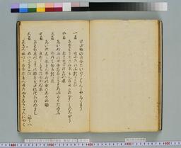 - 古活字版。もと鳥、虫を含め「四生の歌合せ」として作られたもの。近世初期の歌人木下長嘯子(1569-1649)の作とされる。擬人化された魚や獣が恋歌の歌合せを行うという趣向で、魚の歌合せは36種の魚貝を左右にわけ15番、獣の歌合せは20種の獣を10番の歌合せにしたてる。和歌と判詞は活字、挿絵は整版により組版している。「中川氏蔵」は蔵書家中川徳基(得樓。1833-1915)の蔵書印。